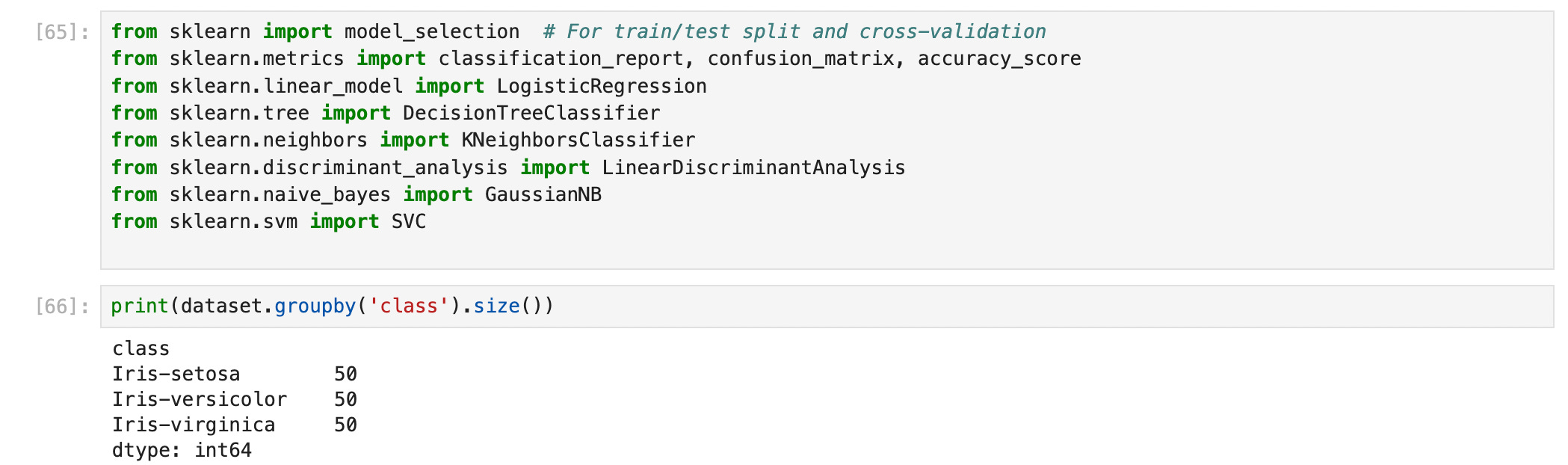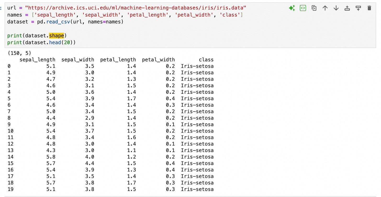 print(dataset.shape) # Shows the dimensions of the dataset print(dataset.head(20)) # Displays the first 20 rowsStep 4: Get Your ML Toolkit Ready