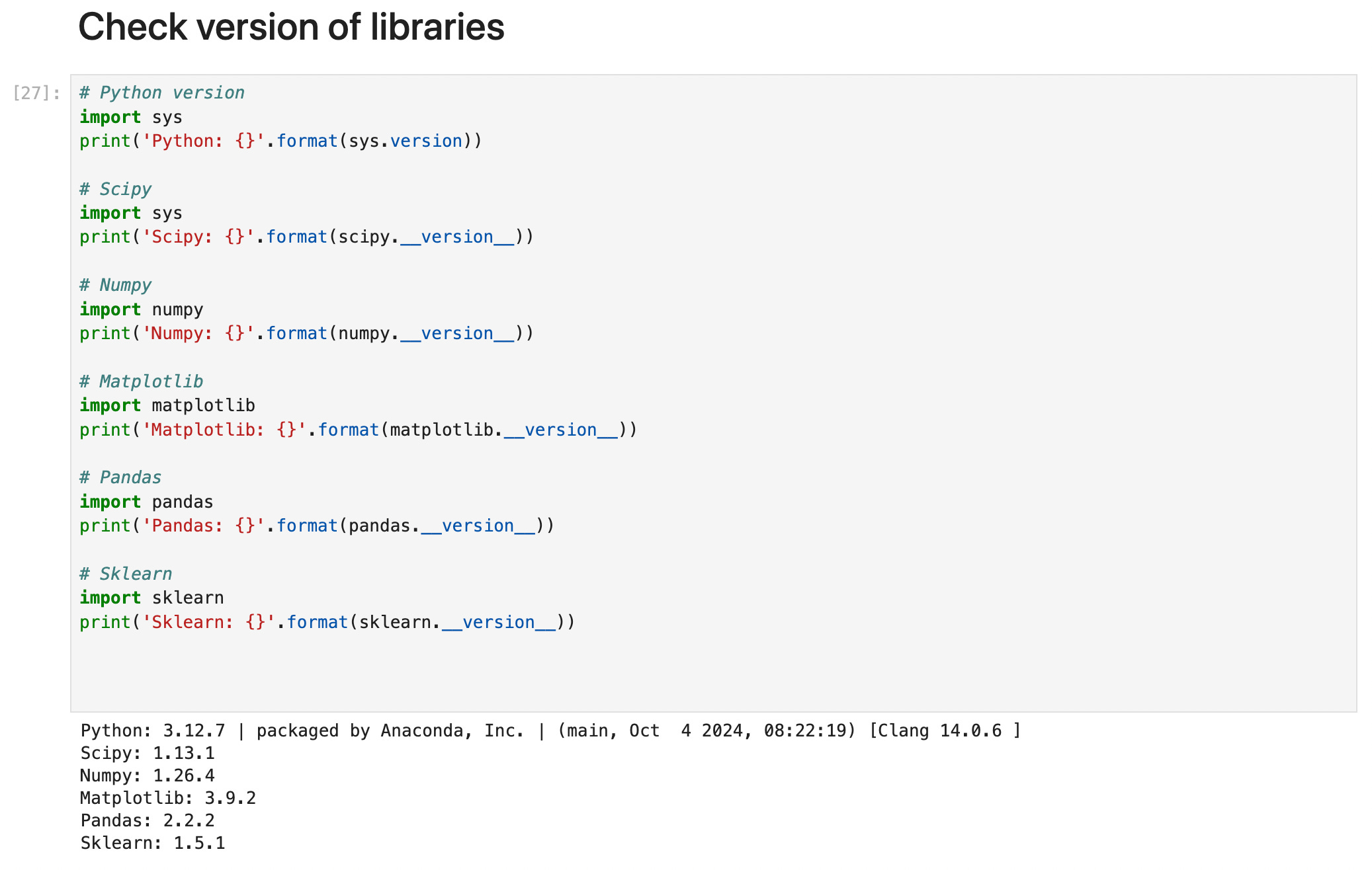 You’ll need several libraries for machine learning and data analysis. Here’s how to check if they’re available and which versions are installed: